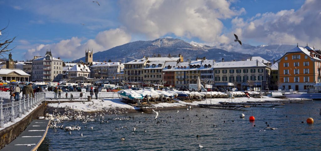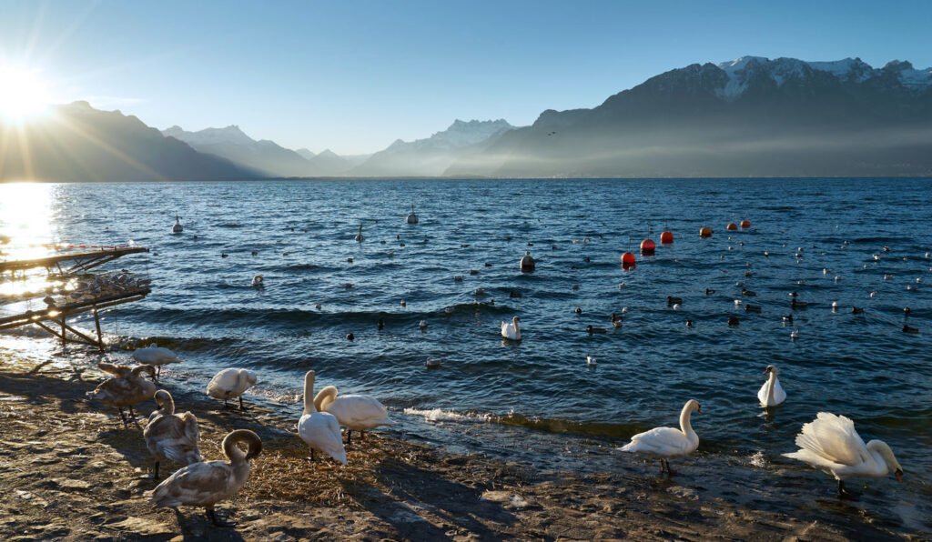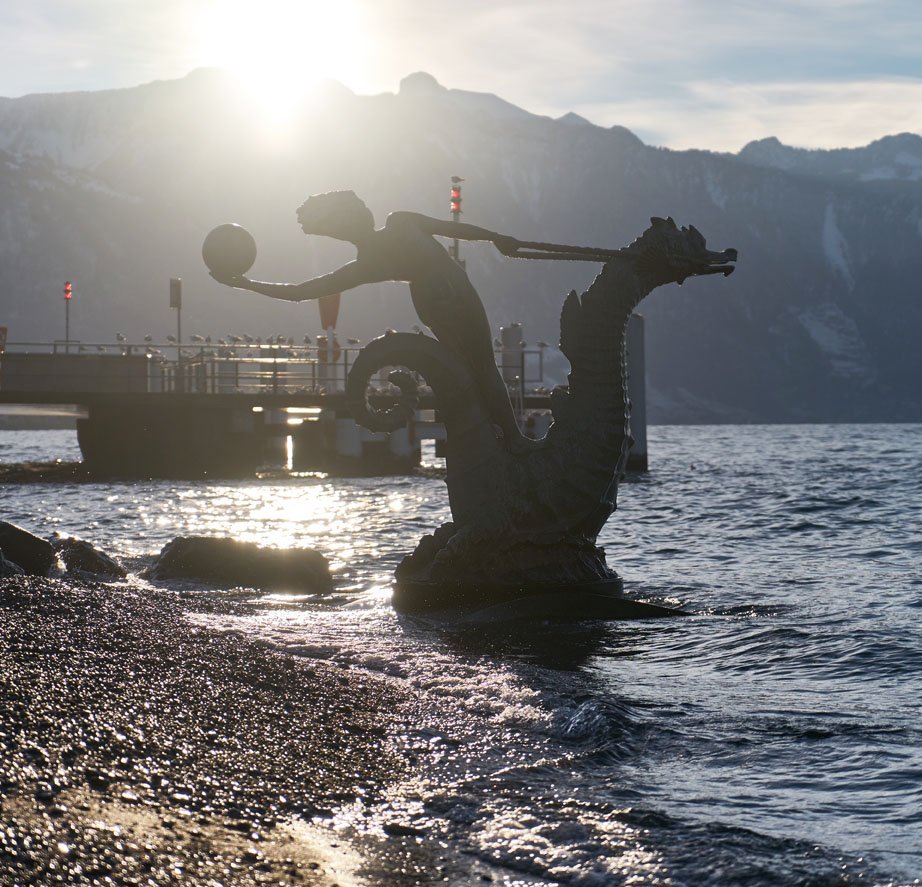 Venez nager dans le cadre magique de la place du marché et du jardin du Rivage de Vevey dans un panorama de rêve.