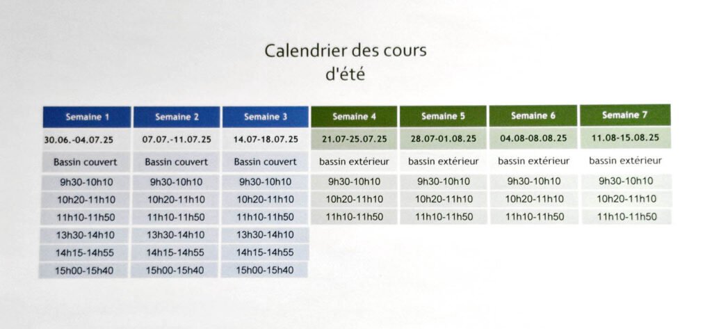 De début juillet à mi-août, il y a 7 semaines au choix (5 cours de 40 min. par semaine). Tous ont lieux à Vevey Corseaux Plage. Vous inscrivez votre enfant pour des cours quotidiens sur une semaine et choisissez un créneau horaire valable pour les 5 cours hebdomadaires. Durant les trois premières semaines les cours ont lieu à l’intérieur (le temps peut encore être capricieux). Les 4 dernières semaines se passent dans le bassin extérieur. Il y a 7 niveaux (dès 4 ans) pour progresser dans toutes les nages; les 6 niveaux habituels et un cours pour les enfants ayant atteints les niveaux 7-9.